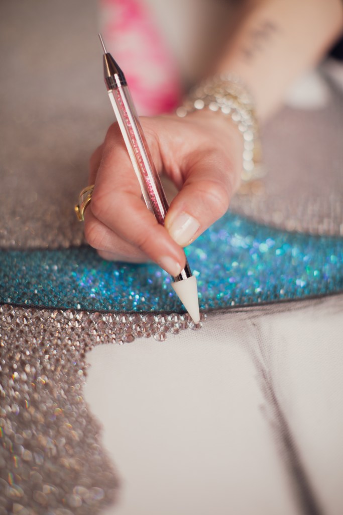 I dipinti acrilico su tela, caratteristici per la scelta di colori saturi e puri, si arricchiscono di materiali sempre diversi, appaiono così sulle superfici dipinte pezzi di stoffa, perle e cristalli, che rendono originale il suo stile.