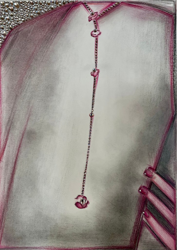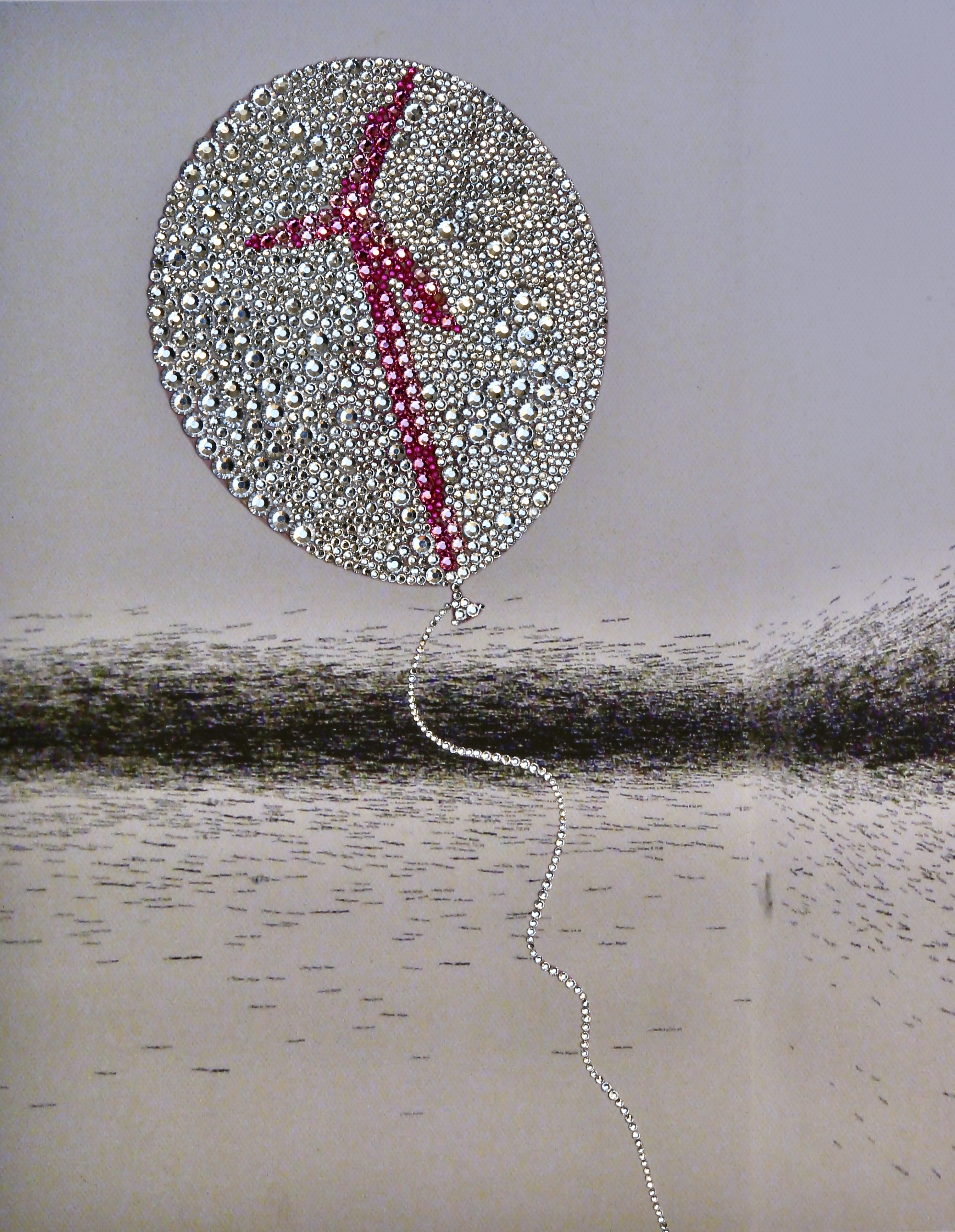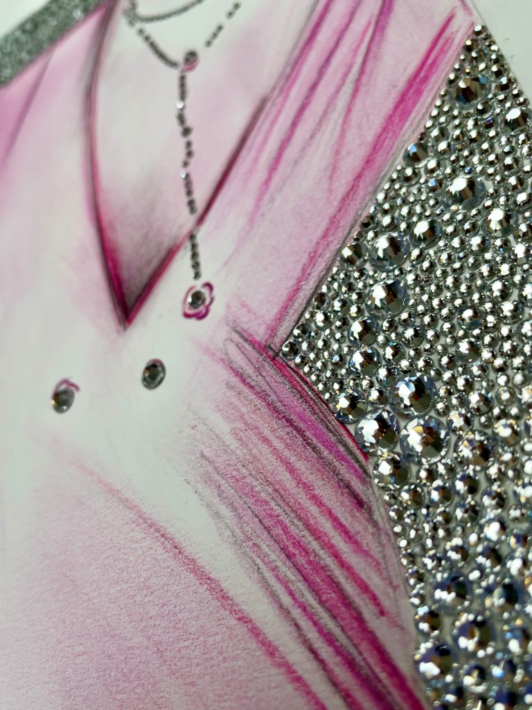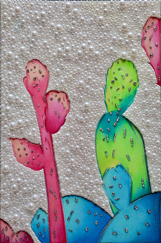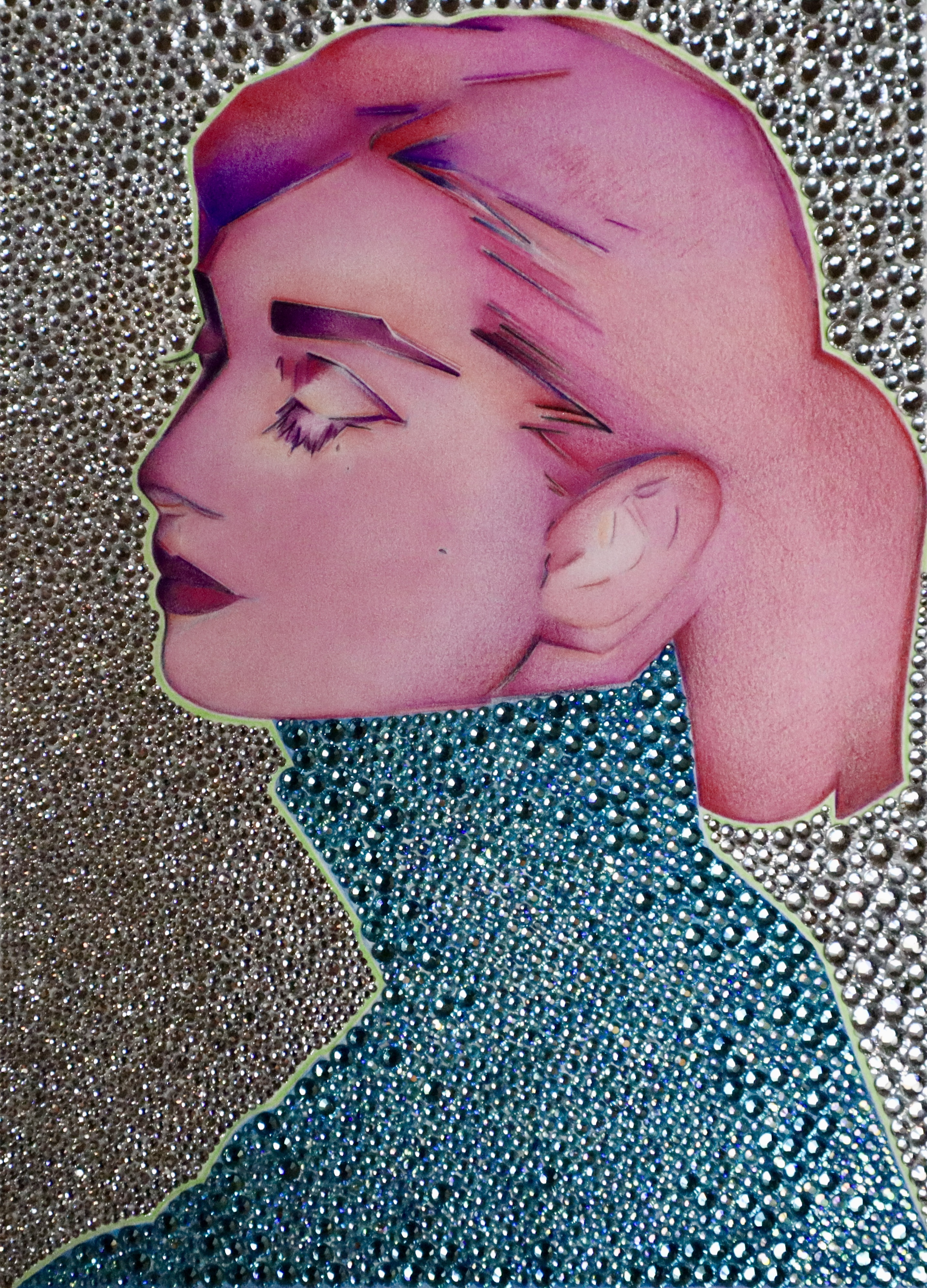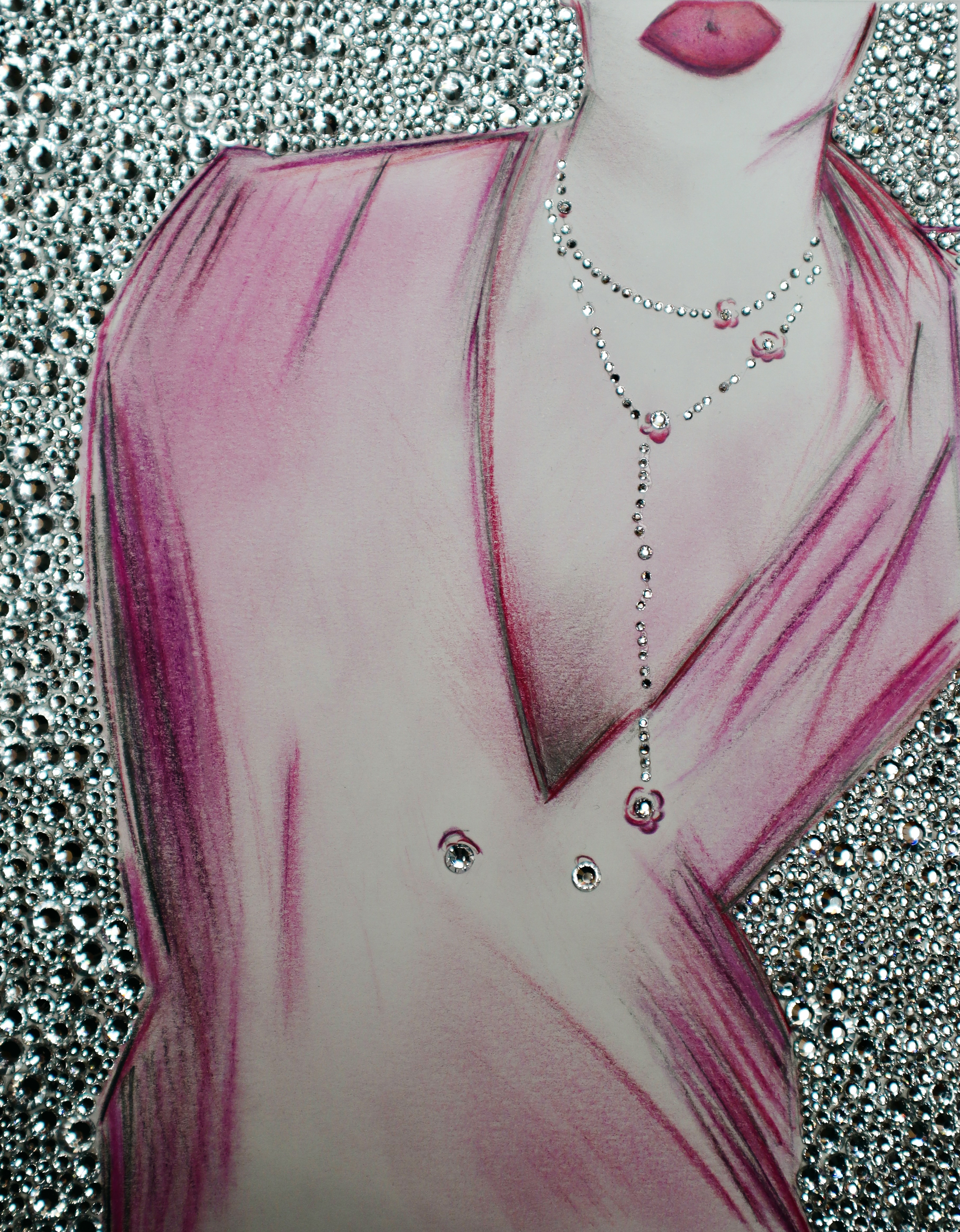 COLORED PENCILS, HAND-APPLIED PEARLS AND CRYSTALS ON PAPER