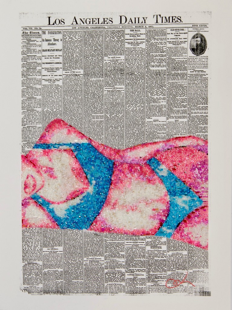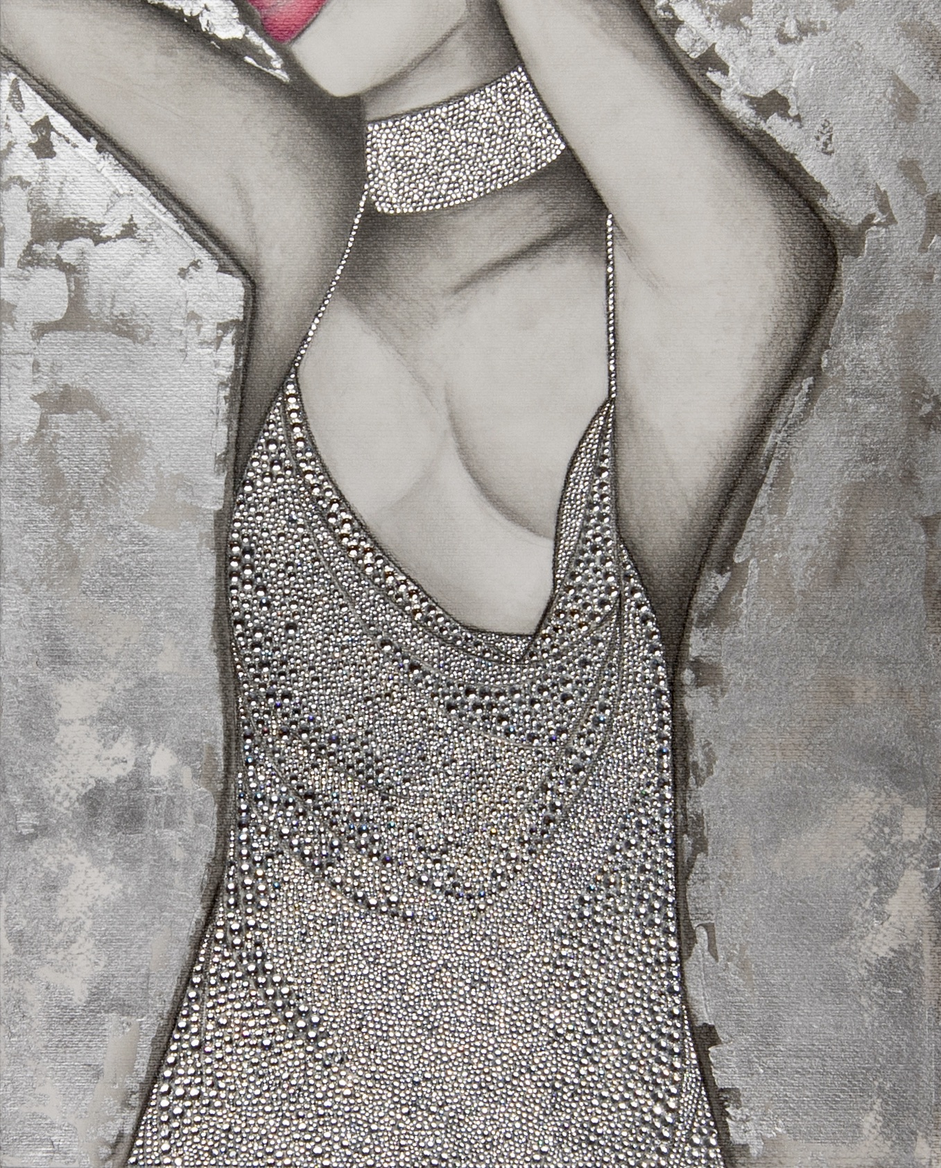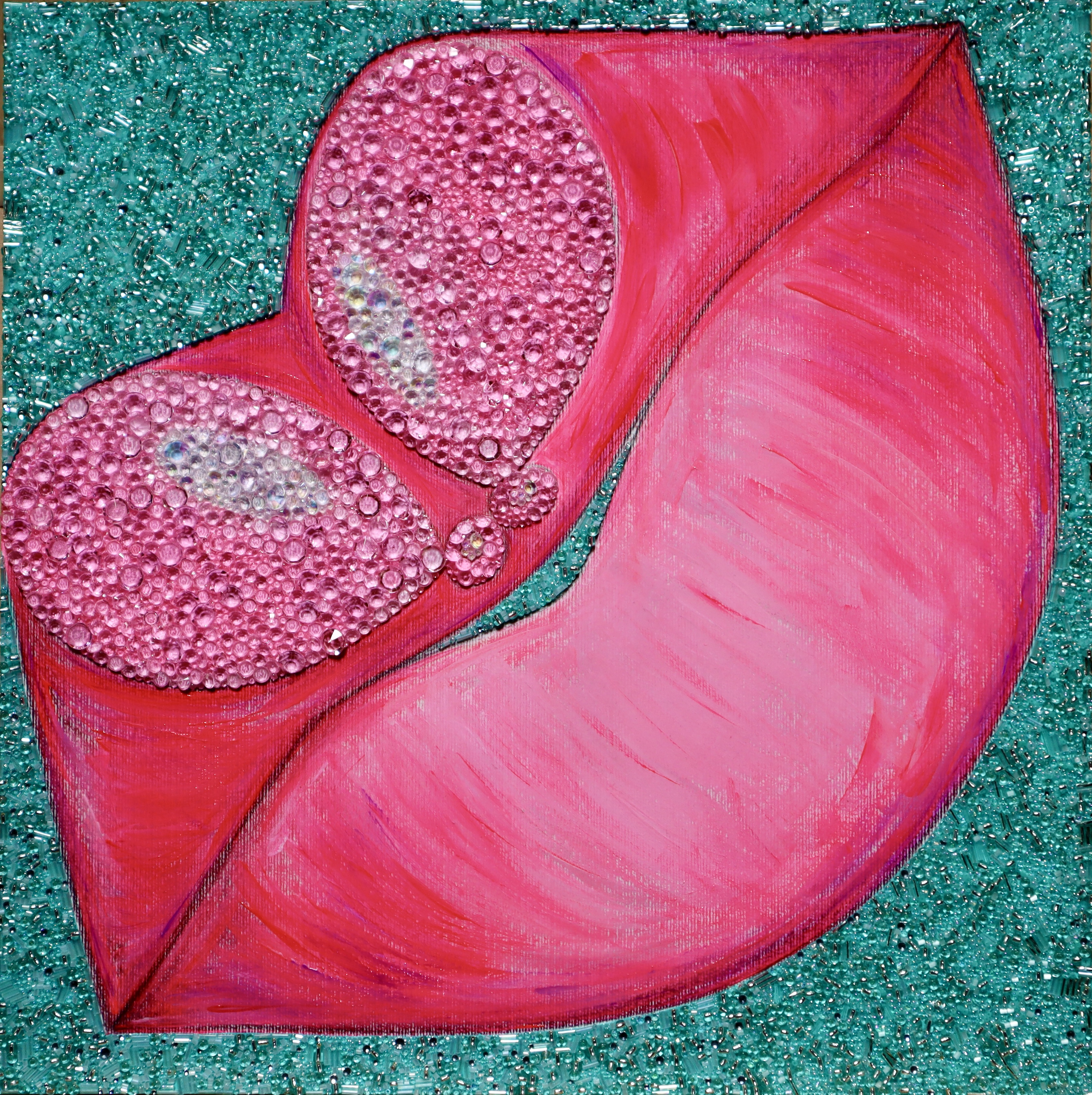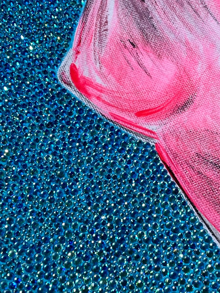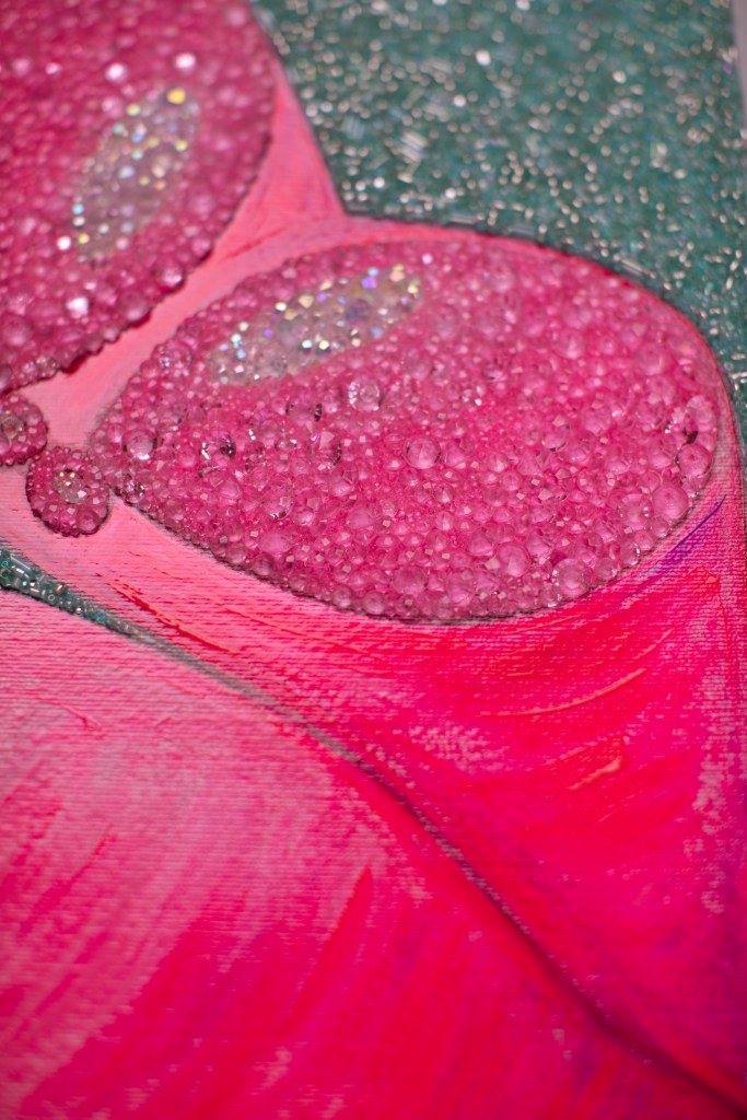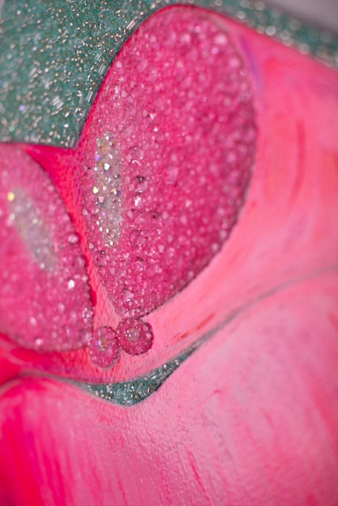 DIGITAL EDITING, HAND-APPLIED PERLS, CRYSTALS, BEADS ON A PRINTED CANVAS