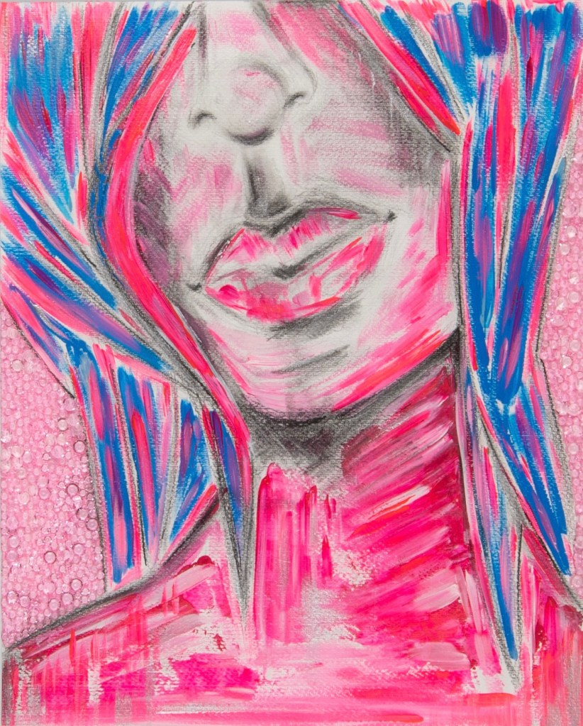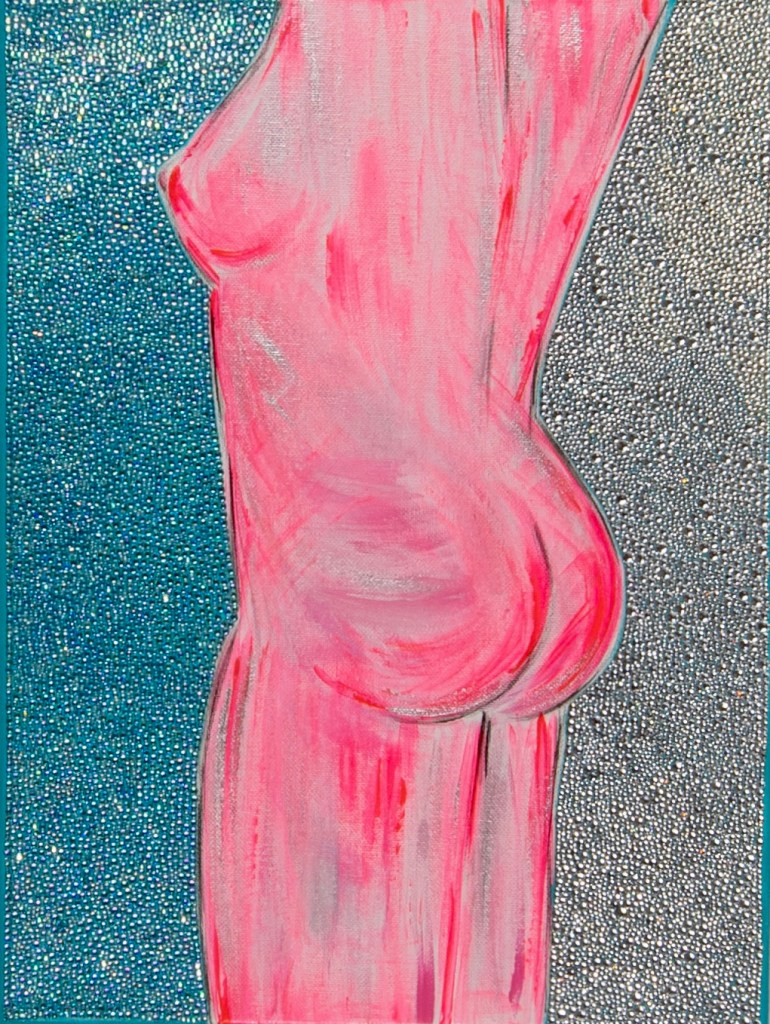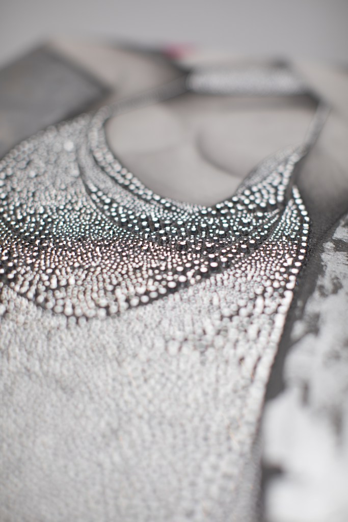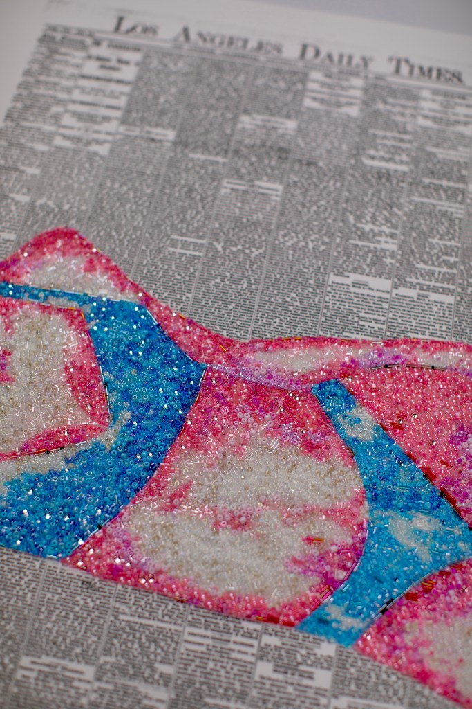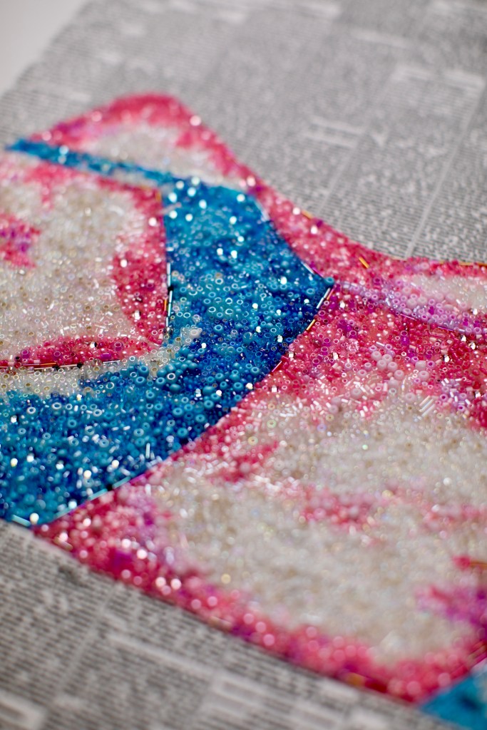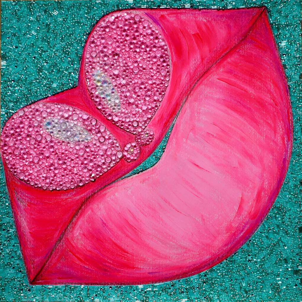 DIGITAL EDITING, HAND-APPLIED PERLS, CRYSTALS, BEADS ON A PRINTED CANVAS