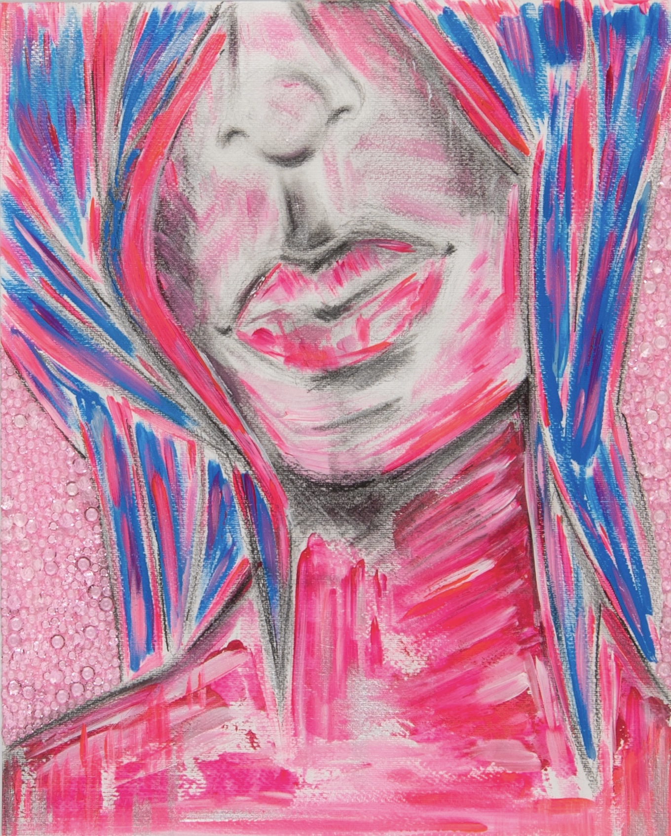 GRAPHITE, ACRYLICS, COLORED PENCILS, HAND-APPLIED CRYSTALS ON COTTON PAPER