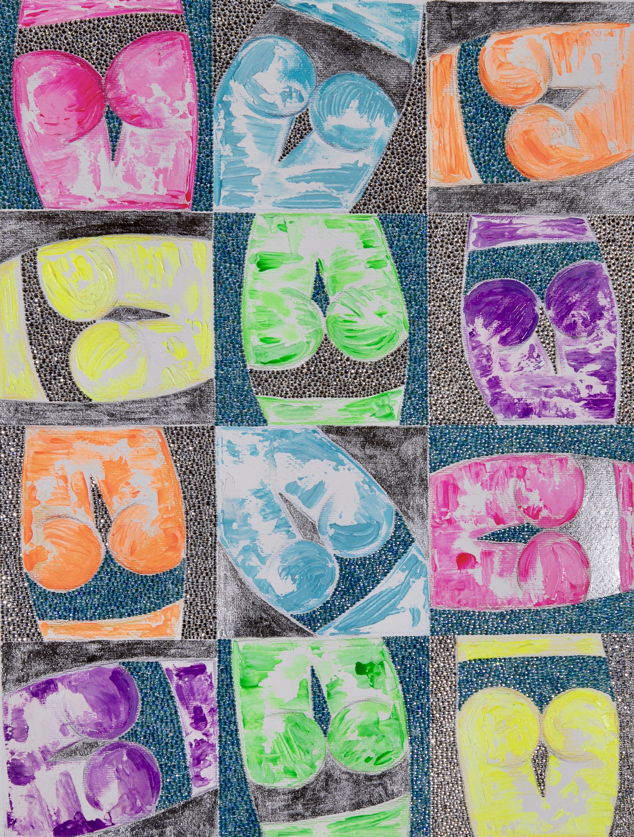 GRAFFITE, COLORED PENCILS, HAND-APPLIED CRYSTALS ON PAPER